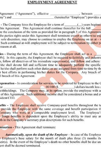 This modifiable form contract is a term employment contract that favors the employee. It provides for a term of employment, benefits, continuation of benefits, employee duties and termination, as well as provisions for benefits upon termination. This contract generally favors the employee and is essential to set forth the terms of the relationship between the employee and organization. The terms could include the duration of the job, employee responsibilities, and grounds for termination.