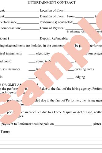 Musicians, Performers, Comedians, Dancers... Never, ever agree to perform without a written contract spelling out the terms of the arrangement. Otherwise you could not get paid, have a dispute about what is included, or lose future bookings and money. This modifiable Entertainer Contract includes terms of what is and is not supplied by the venue and what is and is not expected of the performer. It also contains terms for the parties to set forth the payment time, method and amount. This contract is essential to the arrangements of each party in the relationship, so there is no misunderstanding or miscommunication in the deal.