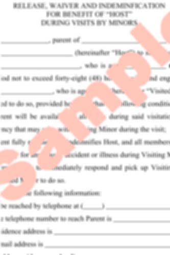 So, your child wants wants the neighbor kid to spend the night. His parents are "all too eager" to drop him off at your house and say "bye". HOLD ON ONE SECOND. Don't you have direct/automatic, and unlimited liability? Are these parent's gonna find some reason to sue you and hit big? Johnny runs and falls and it's your fault. Johnny puts a pin in the wall outlet and it's your fault. Don't take little Johnny in unless you have terms ironed out in advance. This form is a modifiable release, waiver and indemnification form purporting to release the "Host" parties from liability. Never take in a minor without some form of a release agreement, and direct contact and insurance information from the parent. This form provides blanks for the contact information and terms to protect the "Host" parent.