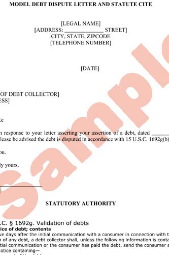 This is a modifiable form letter used to dispute the validity of a debt with a collection agency or debt collector averting "presumed validity" of a debt by the collection agency or creditor. This law then requires a debt collector to "cease collection of the debt, or any disputed portion thereof until the debt collector obtains verification of the debt or a copy of the judgment", after debt if disputed by the debtor within the 30 day notice period, sanctioned by the Fair Debt Collection Practices Act, section, 15 U.S.C. 1629g(b).