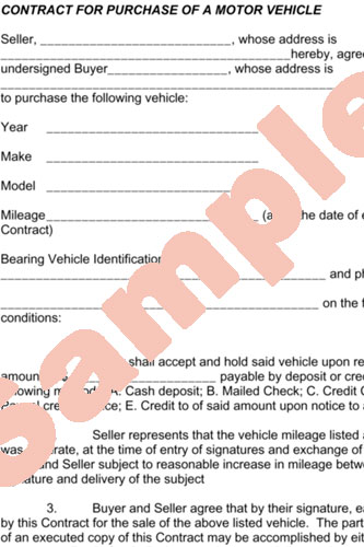This a modifiable car buyer's contract. If your buying a used car from someone you want to be sure to evidence the identity of the parties to the contract and ensure (i) that the seller is the "lawful" seller, that the title is clear and it's not stolen; (ii) that the seller's not lying to you about everything under the sun (VIN matches car, milage accurate, bad accident, parts relpaced, used in a bank robbery -- whatever-- it's all happened before the buyer), (iii) to allow you to register the vehicle and evidence the sale. Never ever, ever, ever, buy a car without a sales contract stating what you want/need it to say.