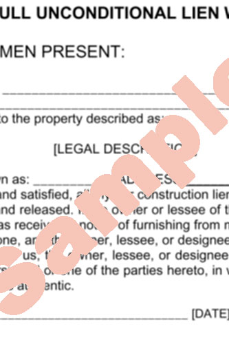 Unwary parties often get burned substantially when doing any renovation or building project by not ensuring an absence of liens, even when they pay all contractors and subcontractors in full. This form is a FULL UNCONDITIONAL LIEN WAIVER, used to ensure that any Contracror, Subcontractor, Repairmen, or Tradesmen either does not file a lien or that any lien filed is "released" via the "lien waiver". Be sure each Contractor signs the Lien Waiver for every job that is done. If the job is started and delayed or not to be paid until completed, use a partial conditional lien waiver form when the contractor stops working on the project. Have one signed and returned, minimally, when every performance check is written. Religiously get signatures on these forms to prevent liens from being recorded by unscrupulous contractors.